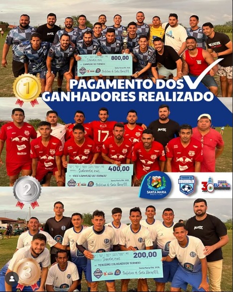 A Prefeitura de Santa Maria informa que os prêmios dos times 1º, 2º e 3º colocados do Torneio na Comunidade da Vila Tota Azevedo já foram pagos e estão nas contas dos ganhadores! 💰⚽